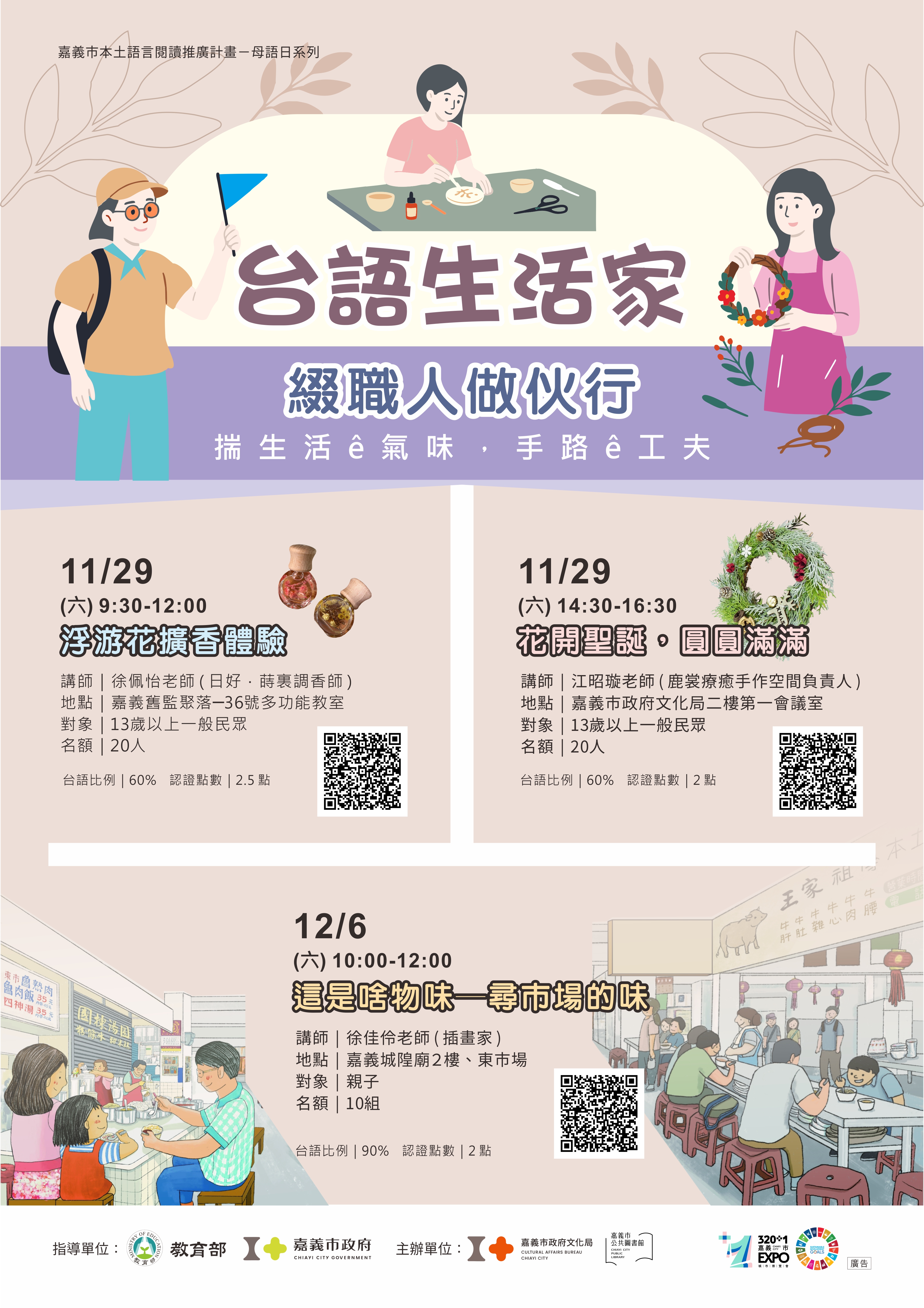 - 活動名稱:本土語言閱讀系列:【台語生活家】綴職人做伙行⑴_11/29(六)9:30-12:00/徐佩怡老師